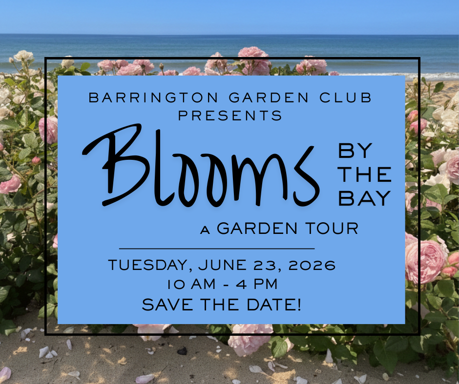 Mark your calendars for Tuesday, June 23, 2026 for the Blooms By the Bay Garden Tour with the Barrington Garden Club